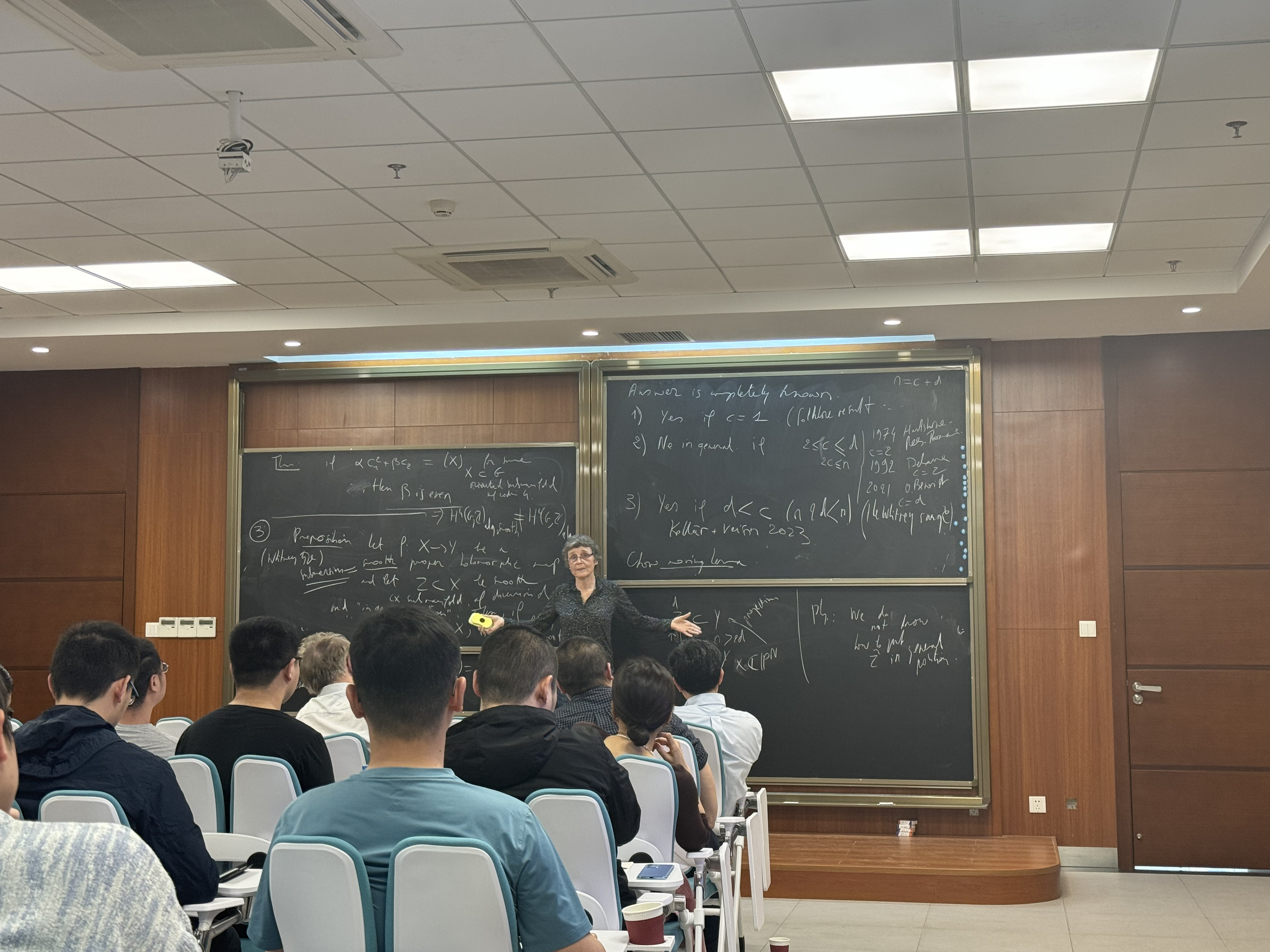 院长穆春来教授主持。Claire Voisin院士从她最新成果入手,讨论了受微分几何中惠特尼嵌入定理(Whitney embedding theorem)启发,由Borel 和 Haefliger在复代数几何中提出的一个相关问题的最新进展。Jean-Michel Coron院士则在报告中简单介绍了何为一维双曲系统,随后重点讨论了如何通过边界控制实现这些系统的稳定。