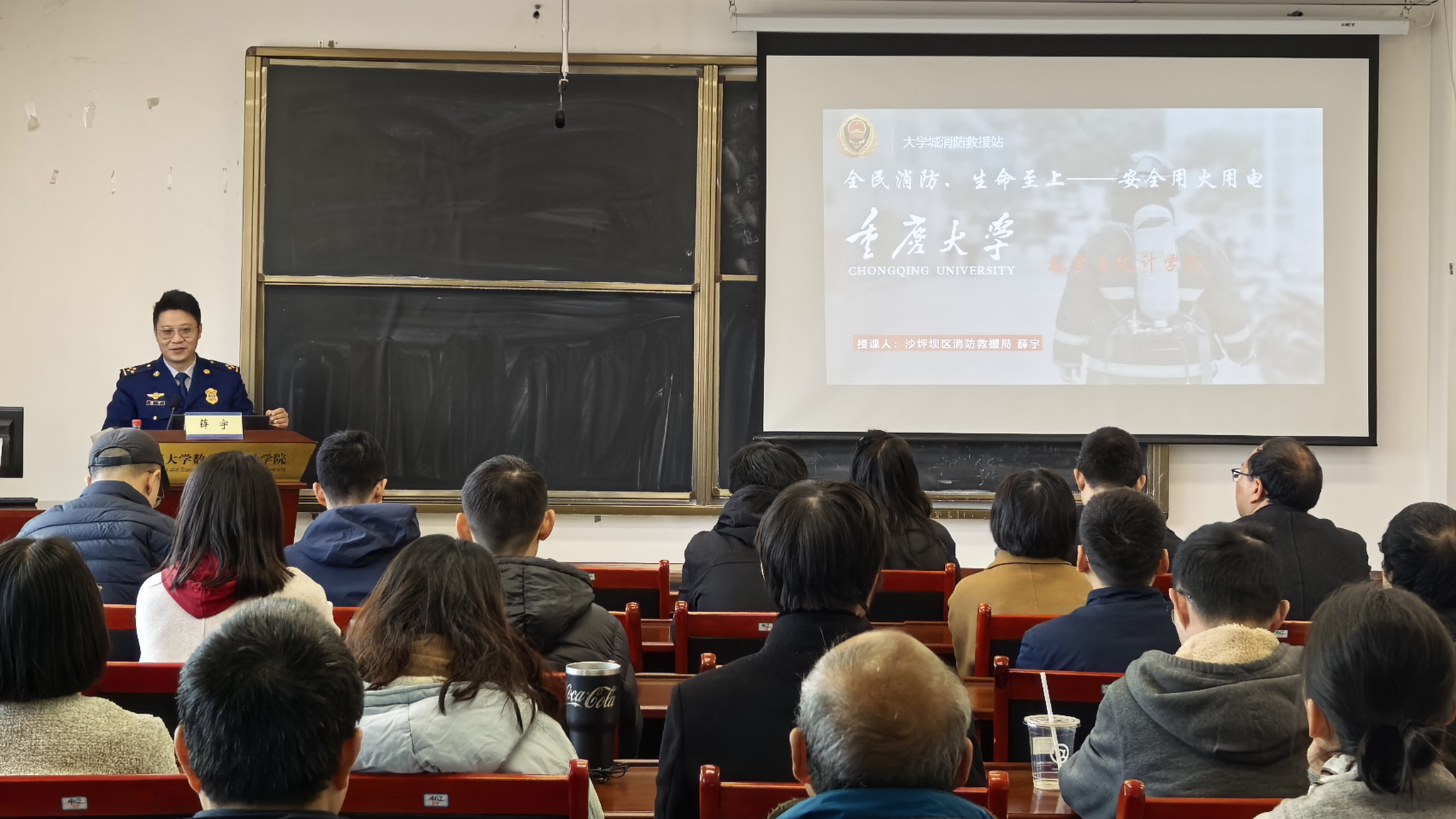 培训中,沙坪坝消防支队大学城站党支部书记、政治指导员薛宇以“安全用火用电”为主题,结合校园火灾事故案例,以案说法,生动形象地讲解了火灾的危害性、预防措施、科学逃生及初期火灾的扑救等消防知识。同时,详细讲解了灭火器、消火栓、防烟面罩等基本消防器材的操作要求和使用方法,让参训教师“懂原理、会操作、能处置”。培训增强了教职员工消防安全意识,进一步了解火灾预防措施及应对方法,初步掌握火灾逃生的基本技能,提升了火灾应急处置能力。